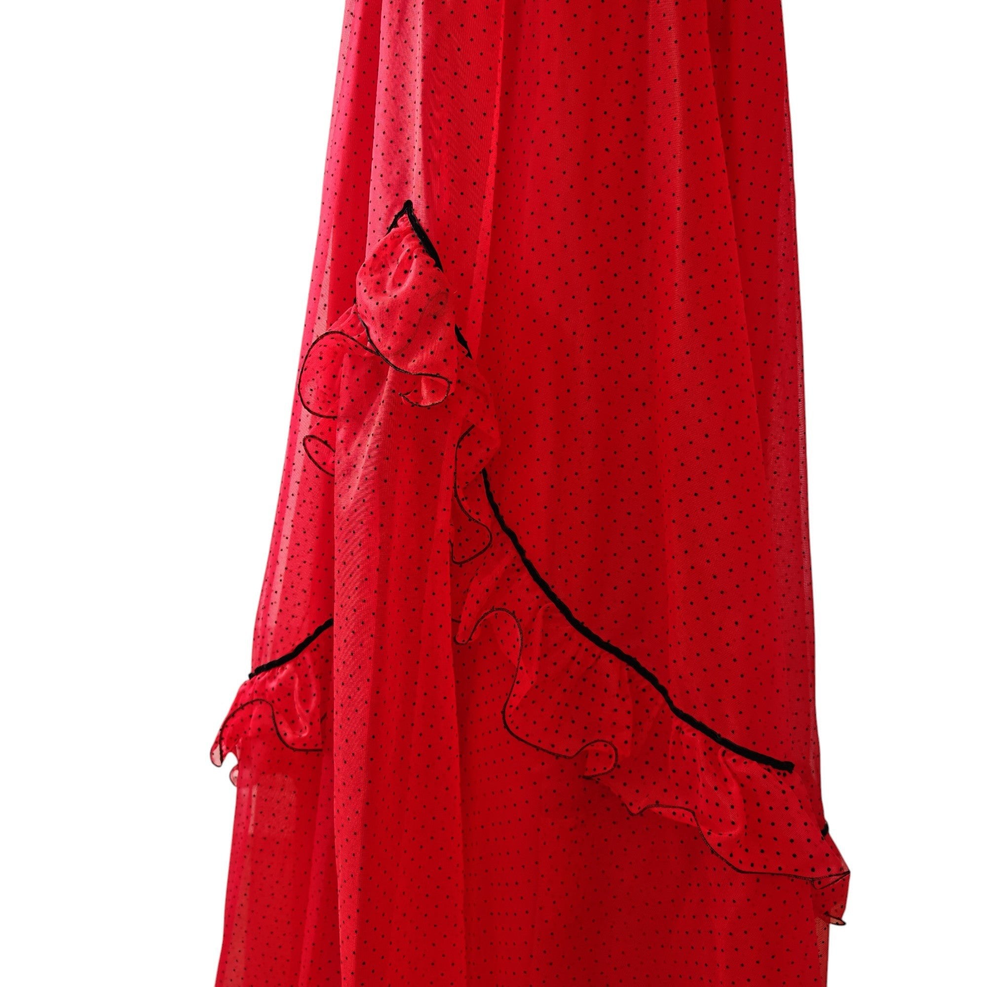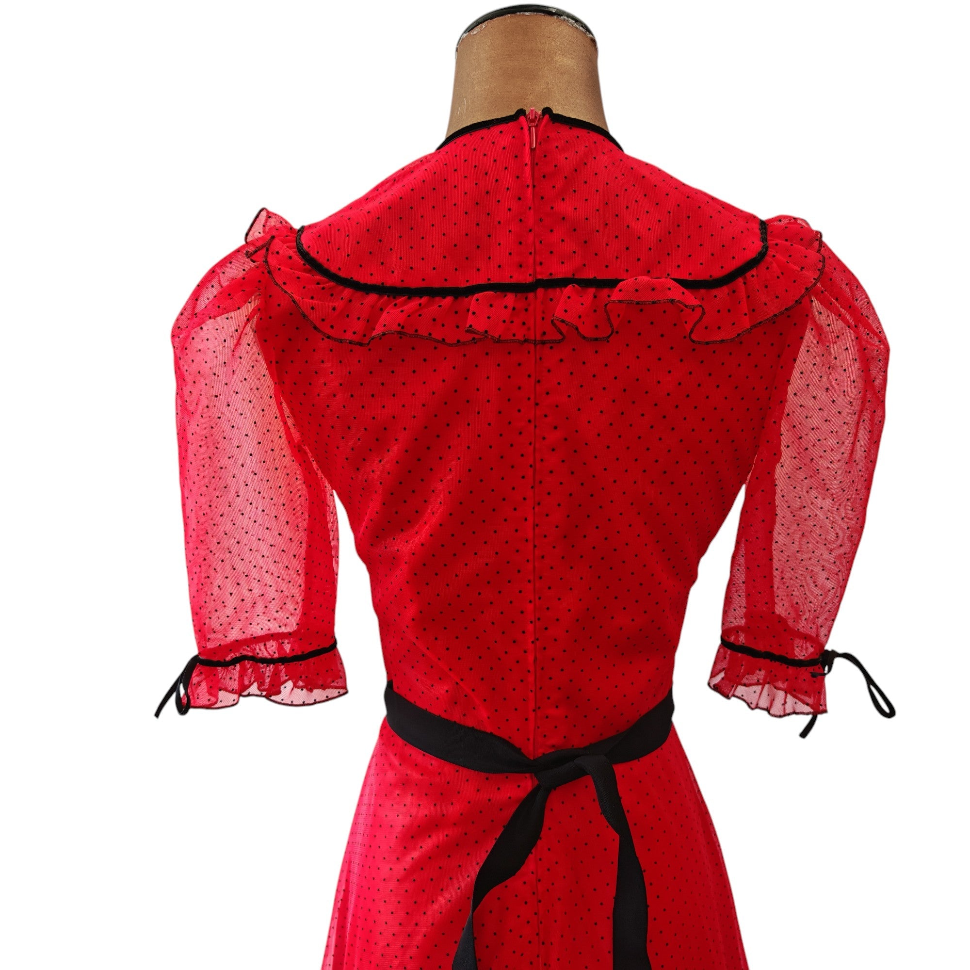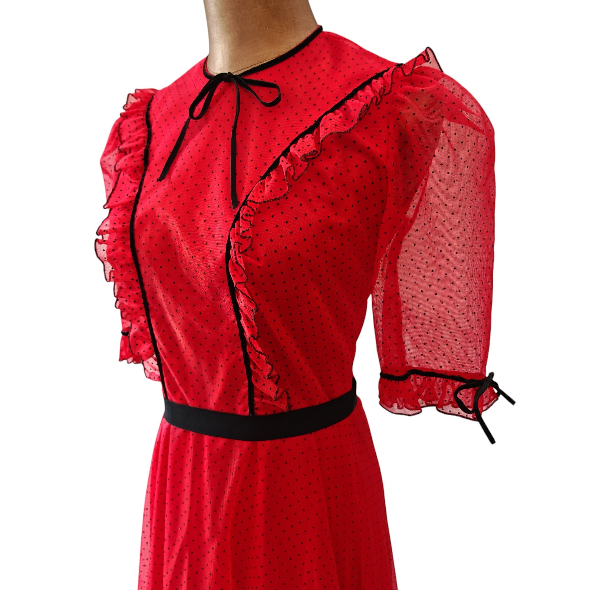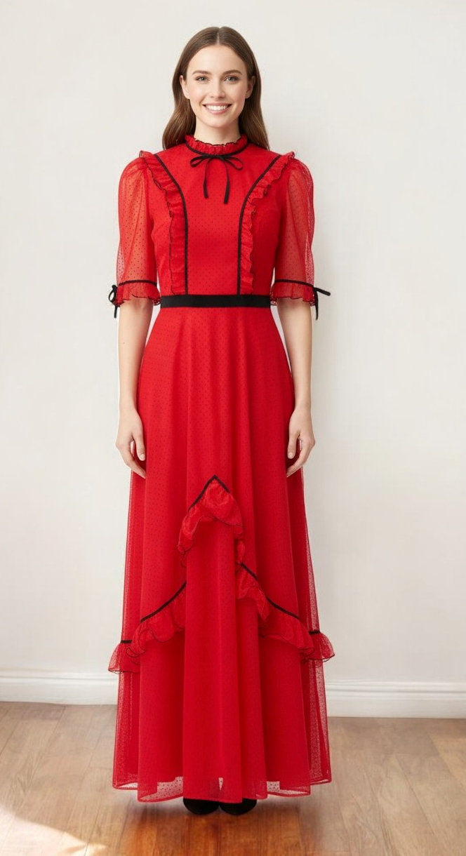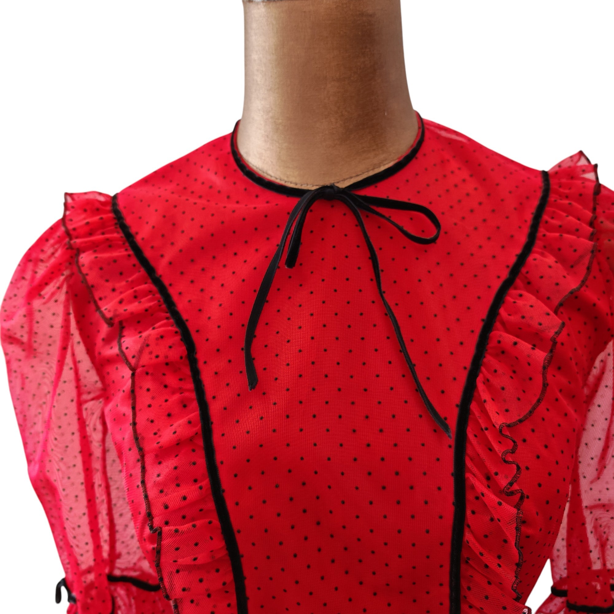 - fitted bodice, with ruffled & black velvet trims